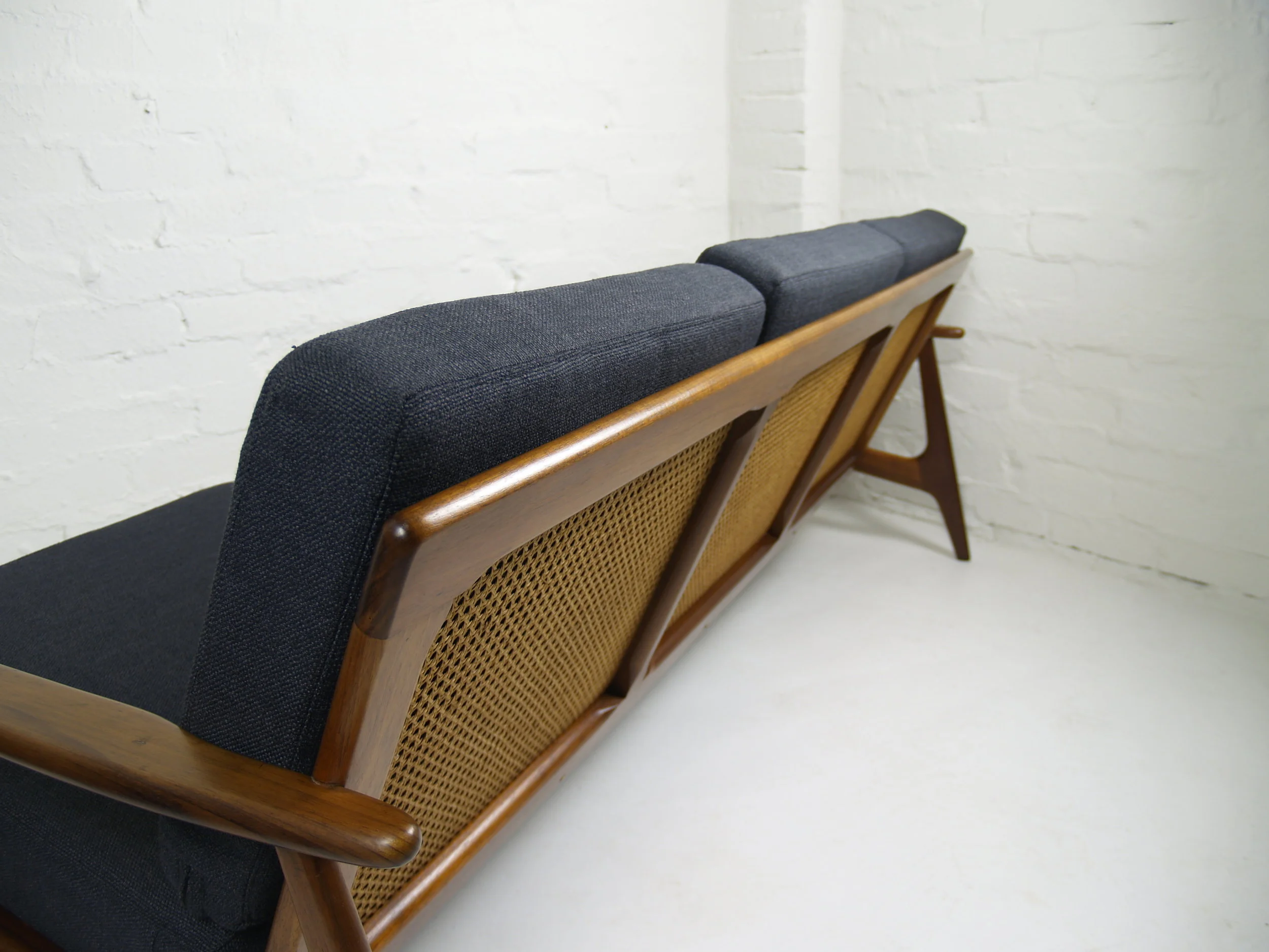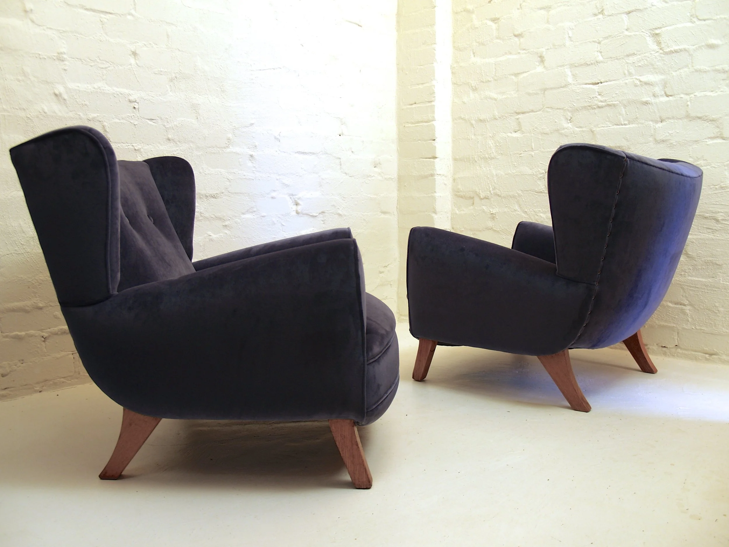 Very good condition. Original rich brown velvet corduroy. Springs in exceptional firm condition, frames firm and sound. One back leg indicates a professional joint repair using timber dowels. Enquire for further images and full condition report.