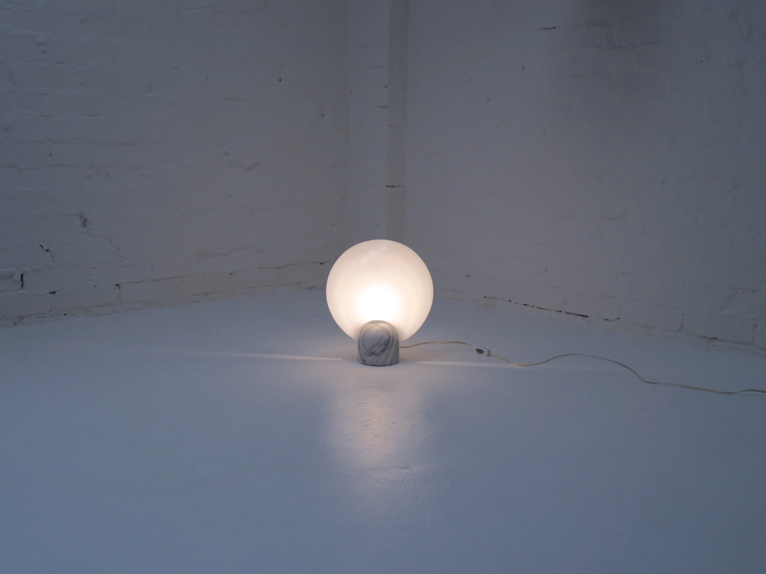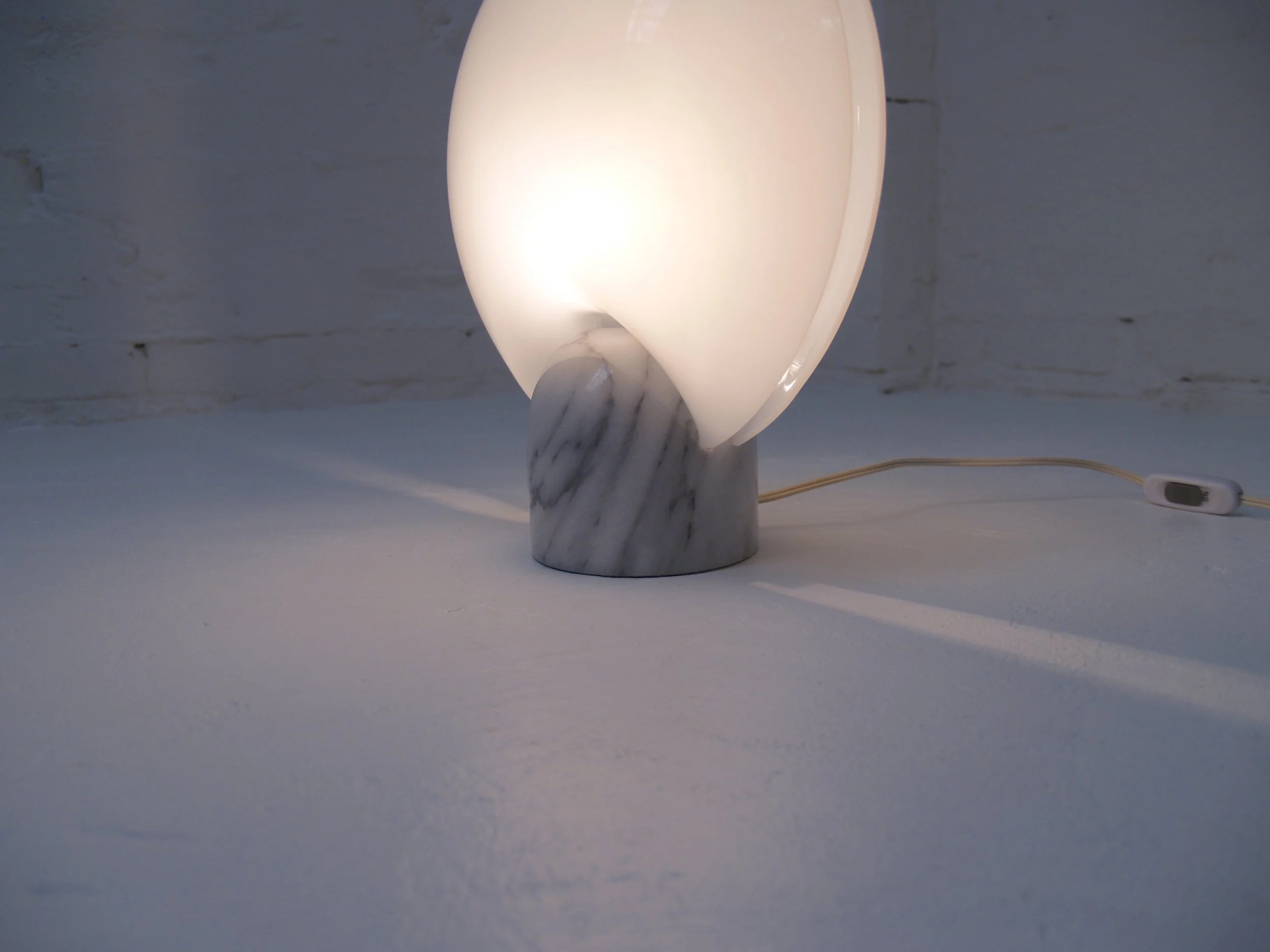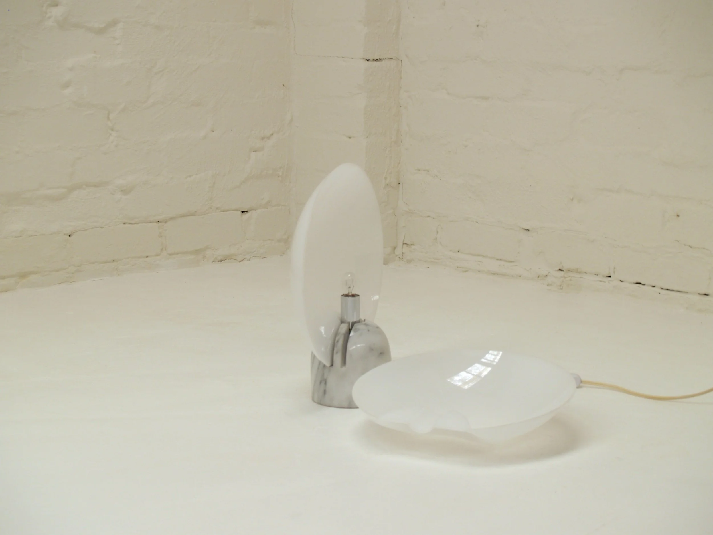 Foxing extensive to brass finish on all parts, forming an appealing patina. Excellent structural condition. Carrara marble base excellent. Inner surfaces of shades excellent. Bakelite bulb fixtures excellent. Fully rewired, tagged and tested to Australian standards.