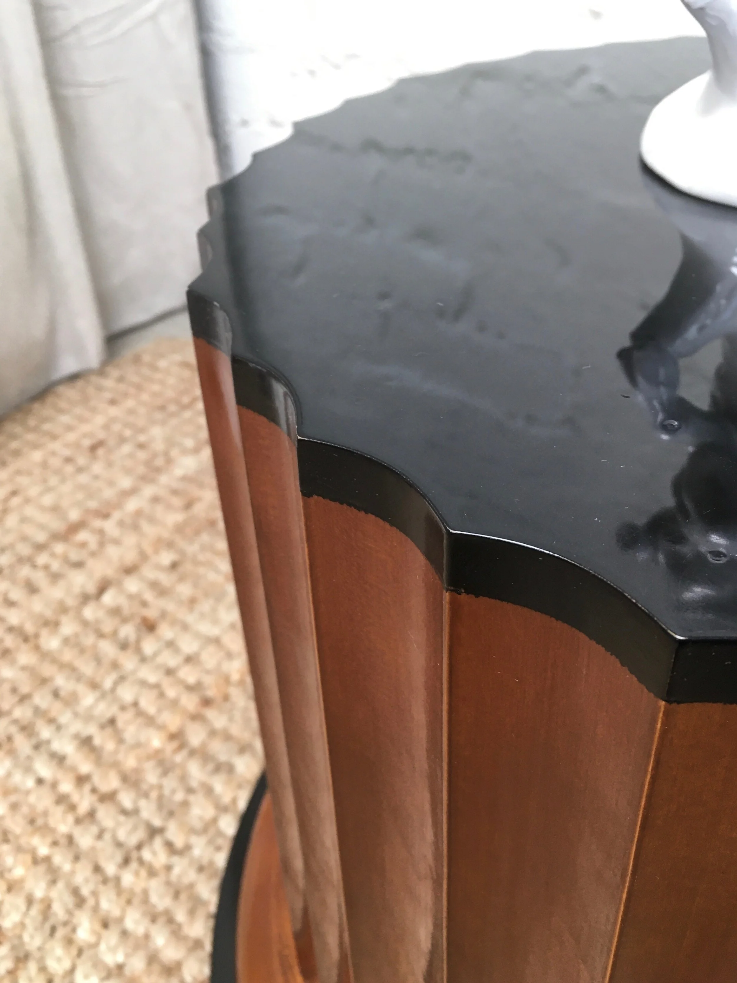A mid century pedestal in the form of a short, fluted Doric column. Consisting of softwood timber with a walnut finish, a black lacquered top and base, sitting on bun feet. Likely dates from the 1970s, Italian.